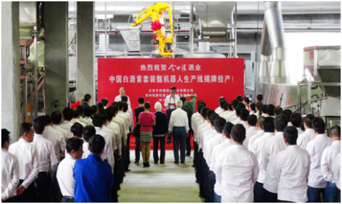 2015年5月22日,yl9193永利中国白酒首套装甑机器人生产线揭牌投产仪式隆重举行。中国工程院院士、哈尔滨工业大学机电控制及自动化系教授蔡鹤皋,公司董事长、总经理周素明共同为项目投产揭牌,并为首日所产原酒封坛、签字。